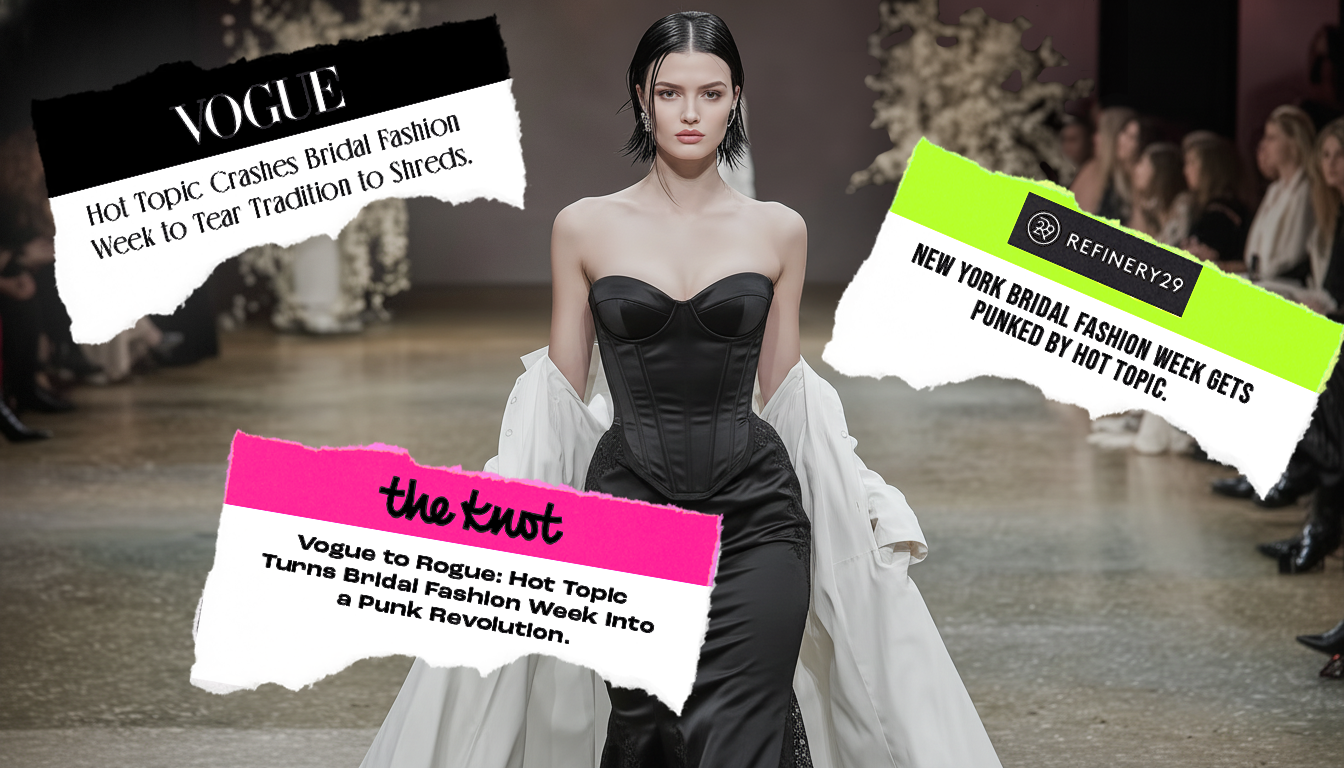 To launch our bridal line, we’re headed to the runway. Hot Topic crashes New York Bridal Fashion Week disguised as a high-end bridal label, with a collection of seemingly traditional gowns. But when the models hit the runway, each dress is ripped, slashed, or stripped to unveil the real designs underneath and the true label behind it all: Hot Topic.