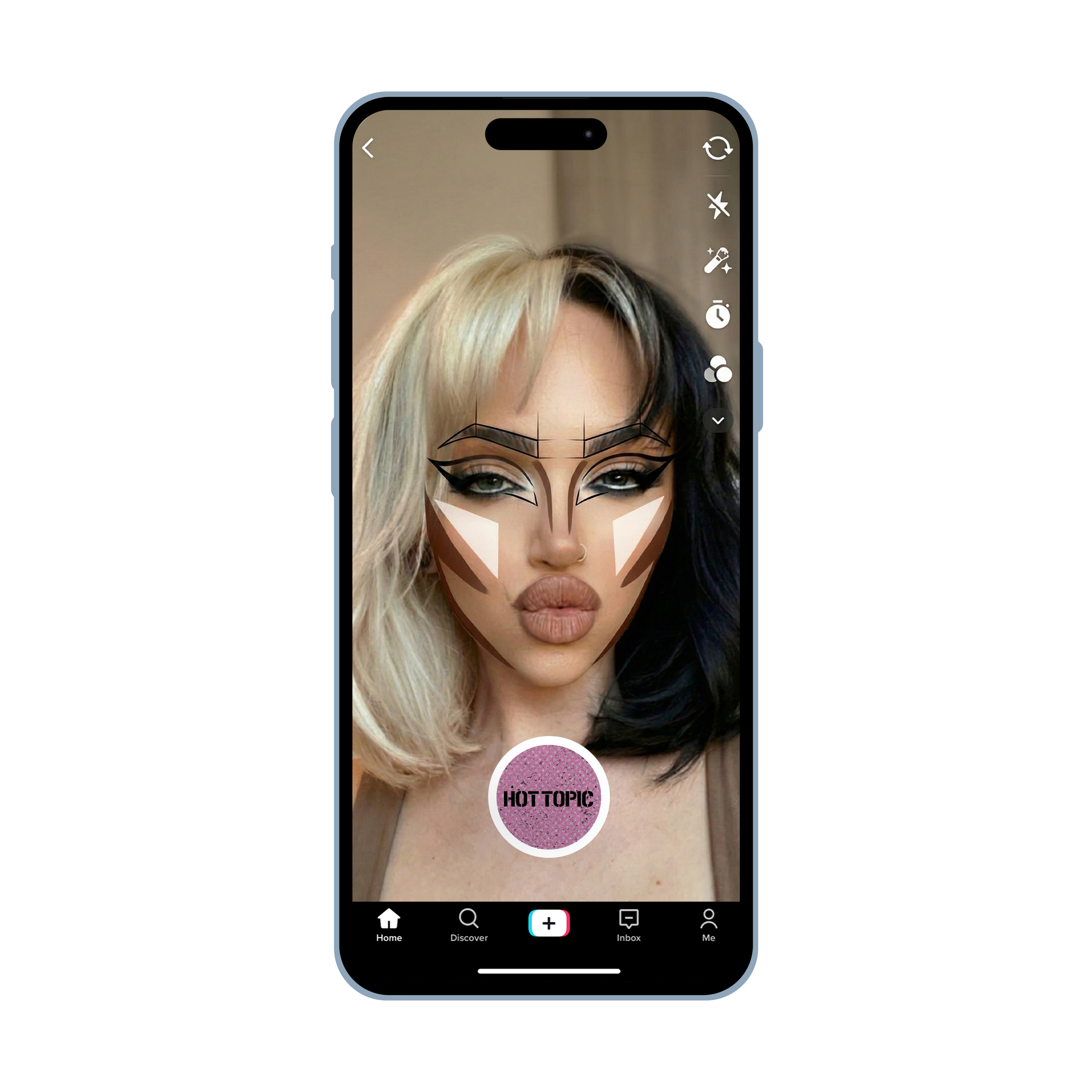 No look is complete without the right makeup. On TikTok, Hot Topic partners with makeup artist Mykie to share alternative bridal makeup tutorials using real-time AR makeup map filters. These filters overlay contour, liner, and highlight guides directly onto users’ faces, making it easy to recreate the looks on screen in real life.