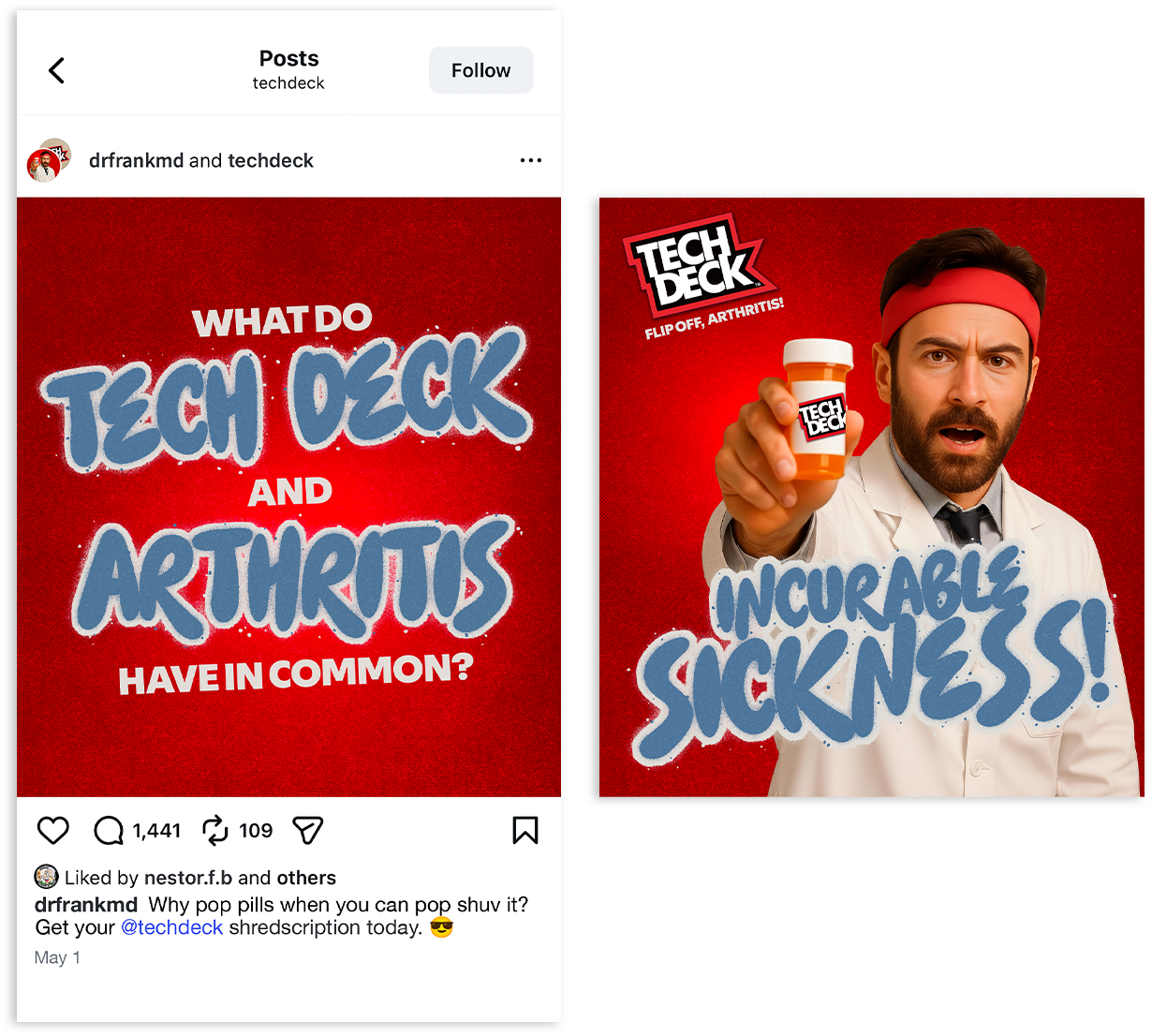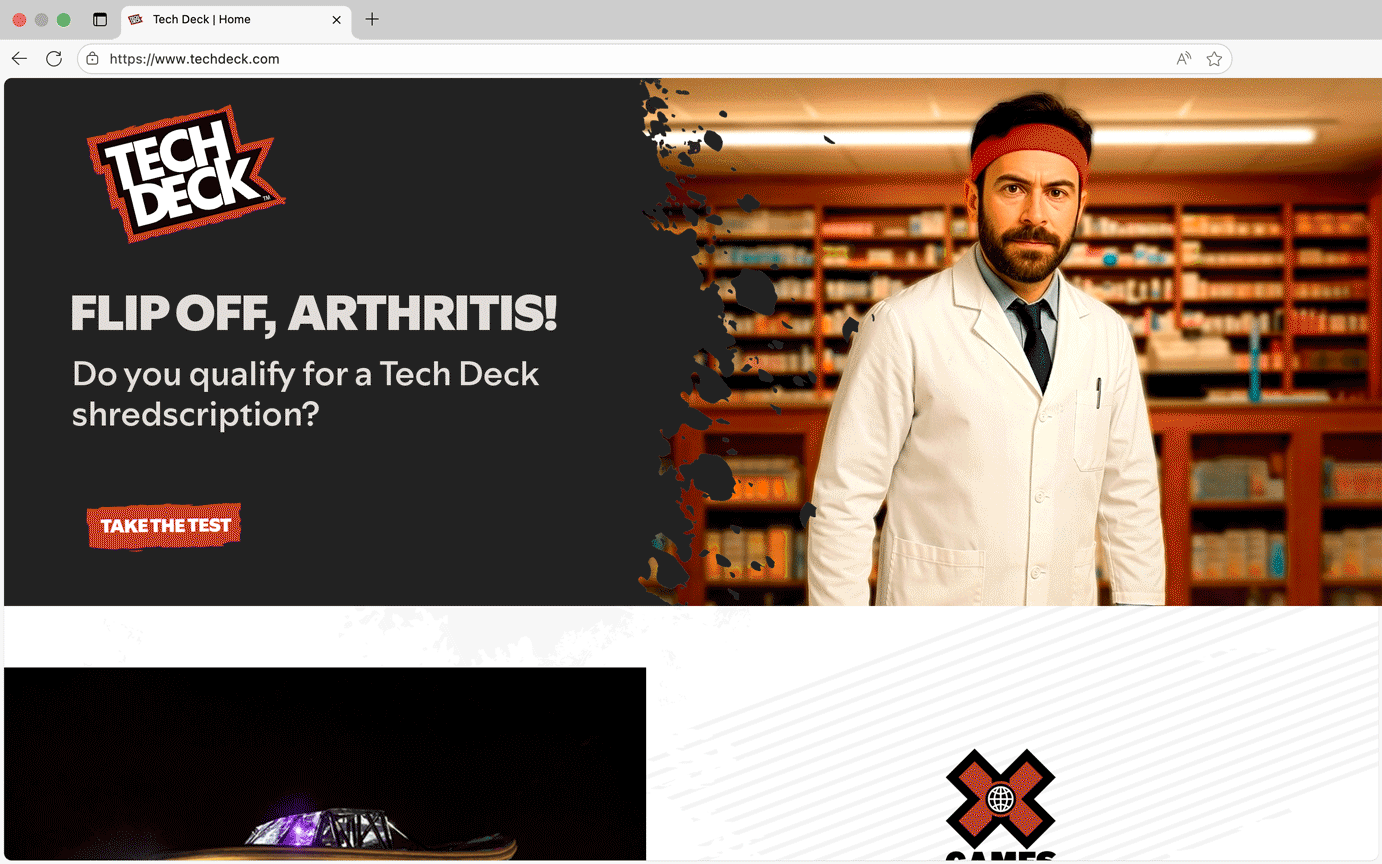 Tech Deck hires their very own online doctor to prescribe you Tech Deck, and his name is Dr. Frank. Head over to the Tech Deck website and take Dr. Frank’s test to receive your Tech Deck “Shredscription.”