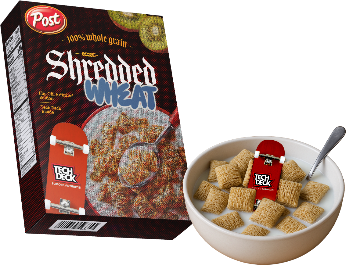 Shredded Wheat is a whole grain cereal that’s recommended for those with arthritis. To make it even more recommended, we’re adding extra shred to Post’s “Original Shredded Wheat” with Tech Deck.