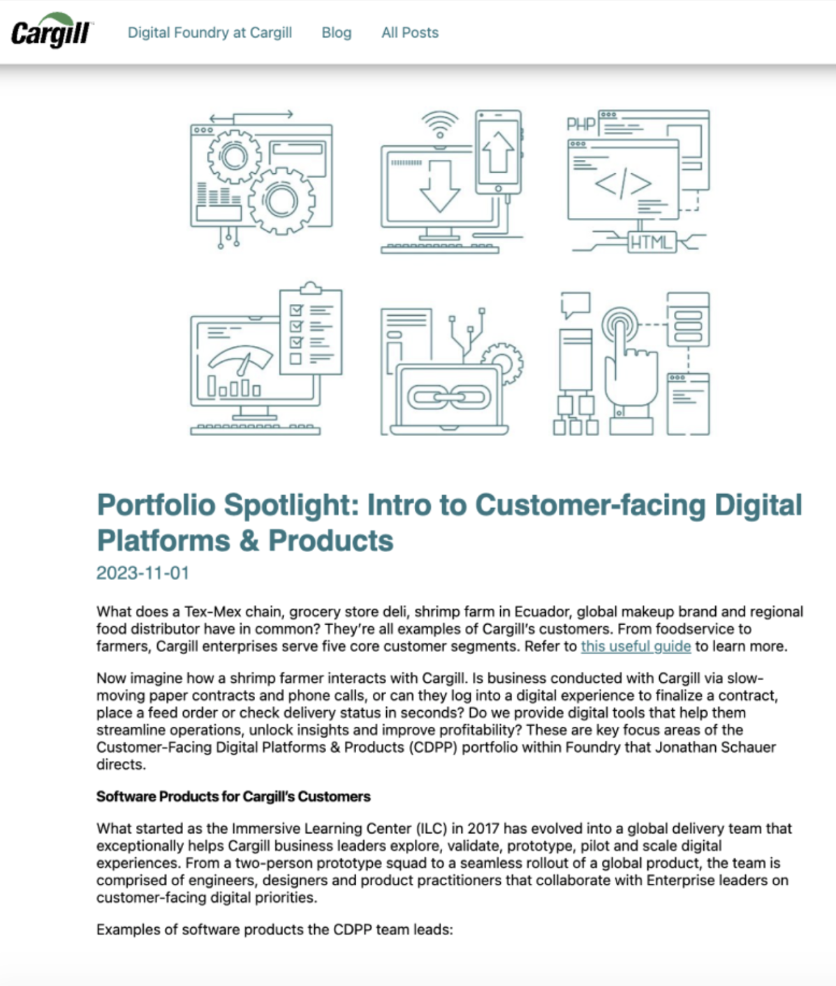 It’s time to flex my long-form writing muscles. As editor lead, writer, and Marketing Communications (MarCom) team lead, my team and I published over 100 blog posts telling the stories of the people, projects, and events of Digital Foundry; a global team of over 300 technology, digital, and software professionals that serve the food and ag-tech company Cargill. I was also a web and mobile UX copywriter for an office services platform dedicated to Digital Foundry employees headquartered in Minnesota.